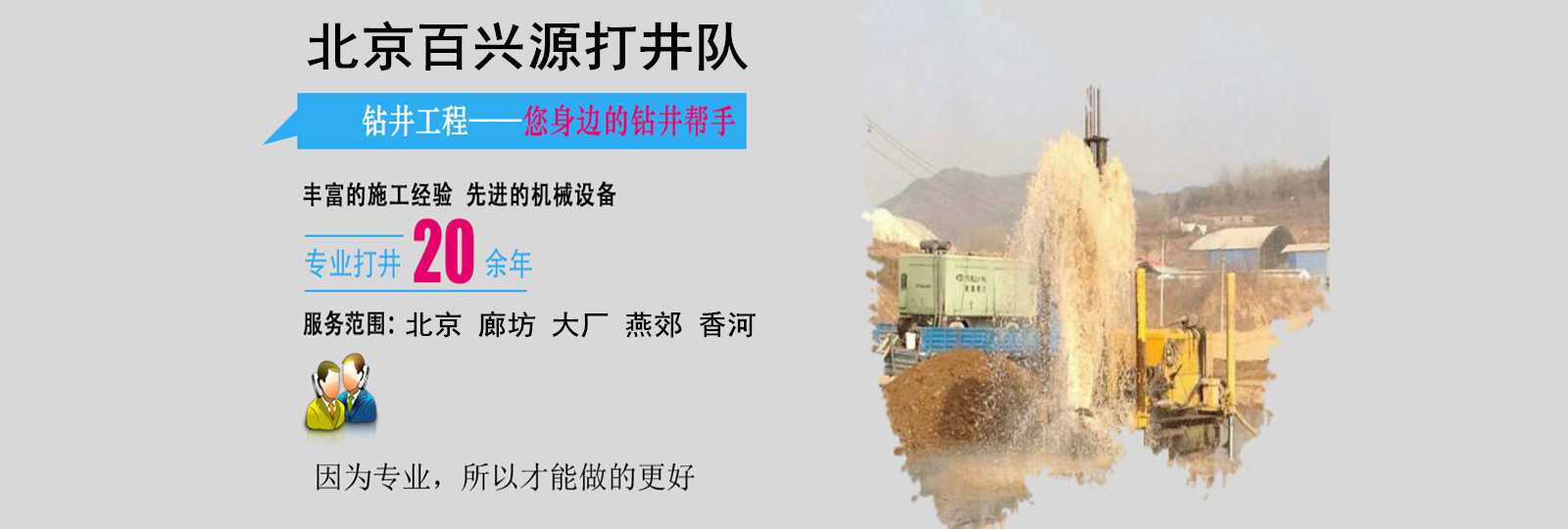 北京百兴源打井队凭借十几年来的钻井项目施工经验,以科学设计、严格管理、精心施工为目标、利用导向钻进技术,绕过已有地下管线或其他障碍物,已经出色地完成了众多机械钻井工程项目,并拥有先进的生产设备和检测设备。